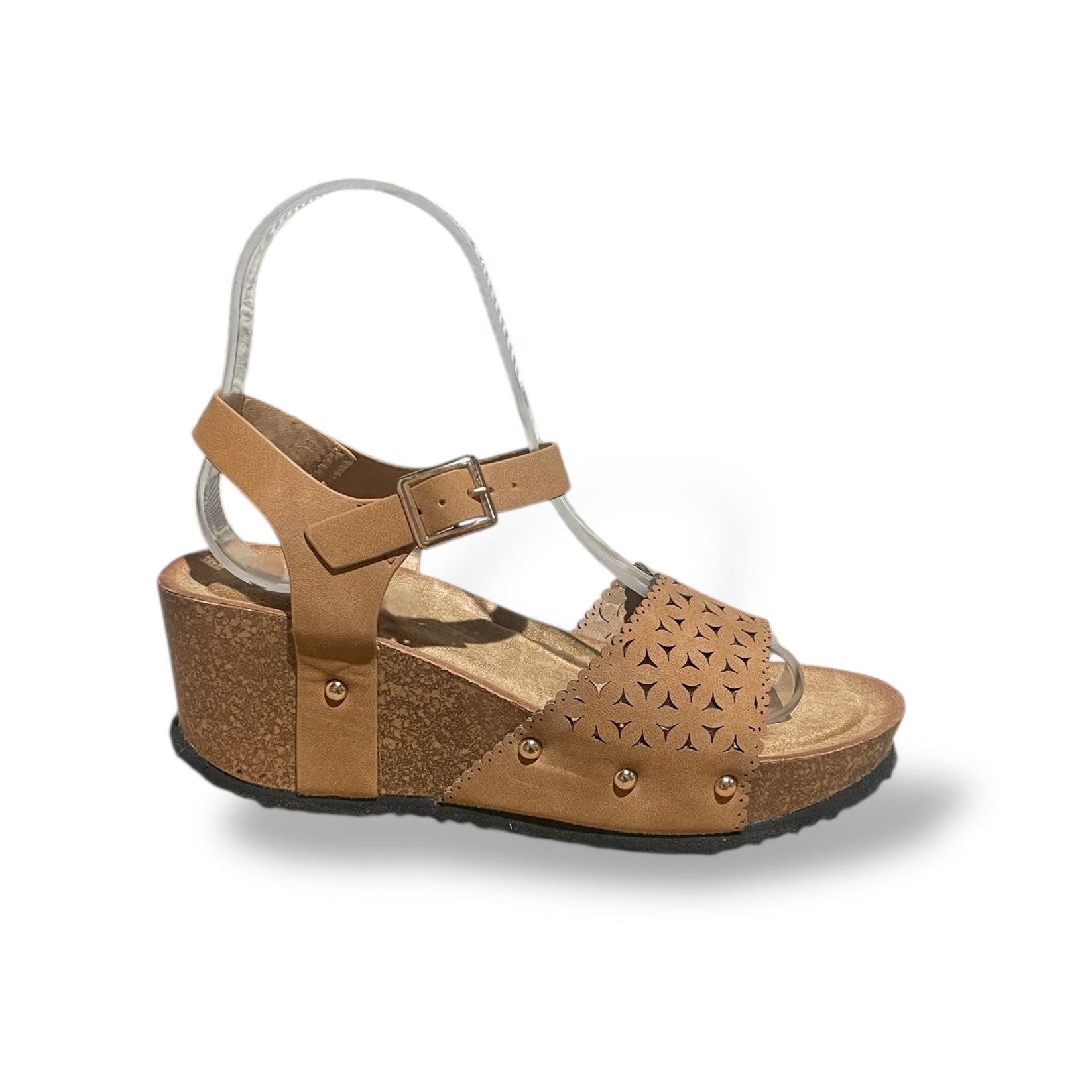 Sandalia estilo comodón con plantilla de gel con suela antideslizante y cierre de hebilla en color camel