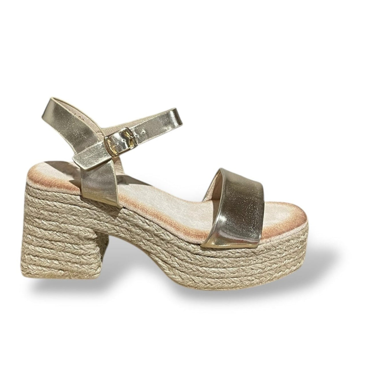 Sandalia de tacón ancho de esparto con plataforma y hebilla color oro