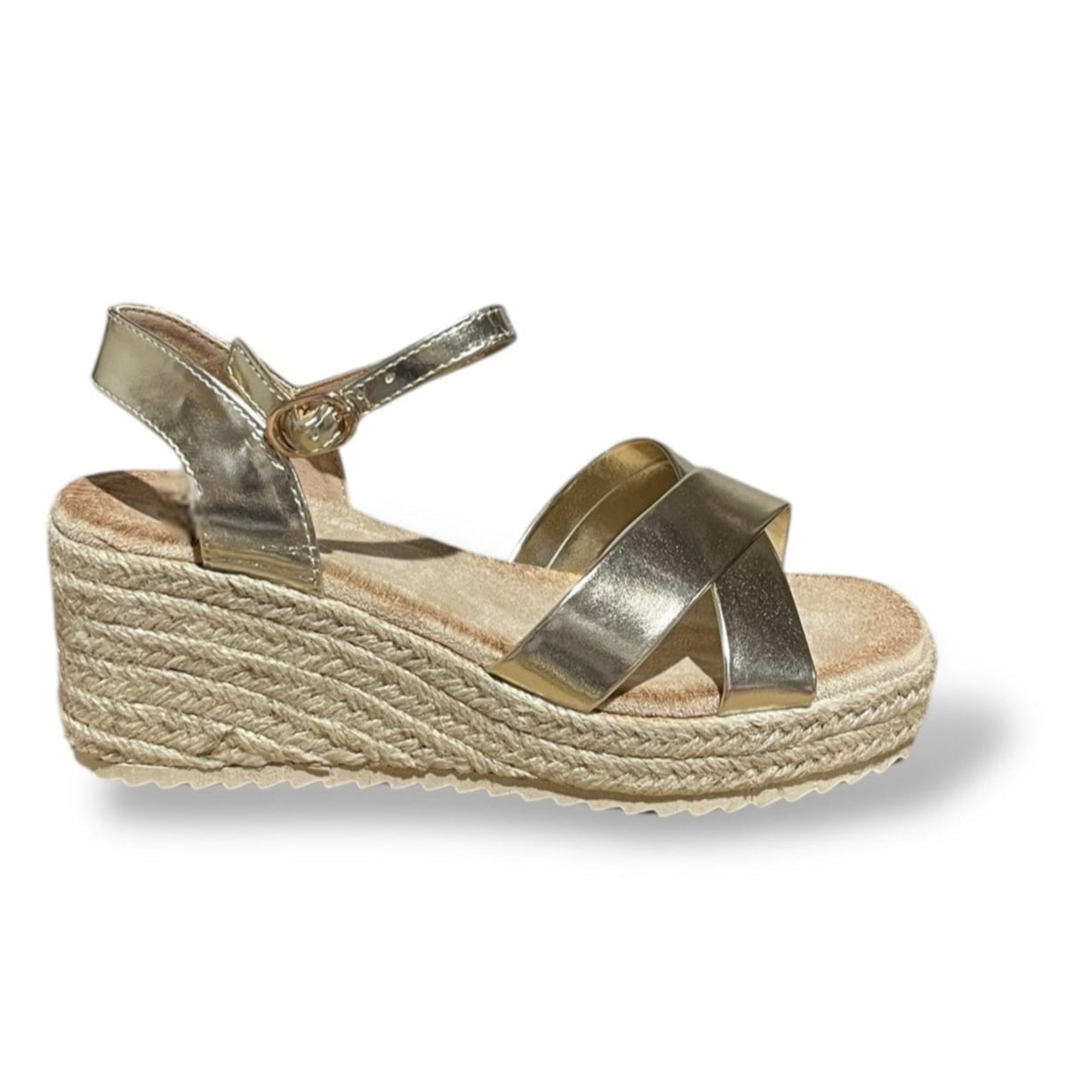 Cuña de esparto con plataforma con tiras cruzadas y hebilla color oro
