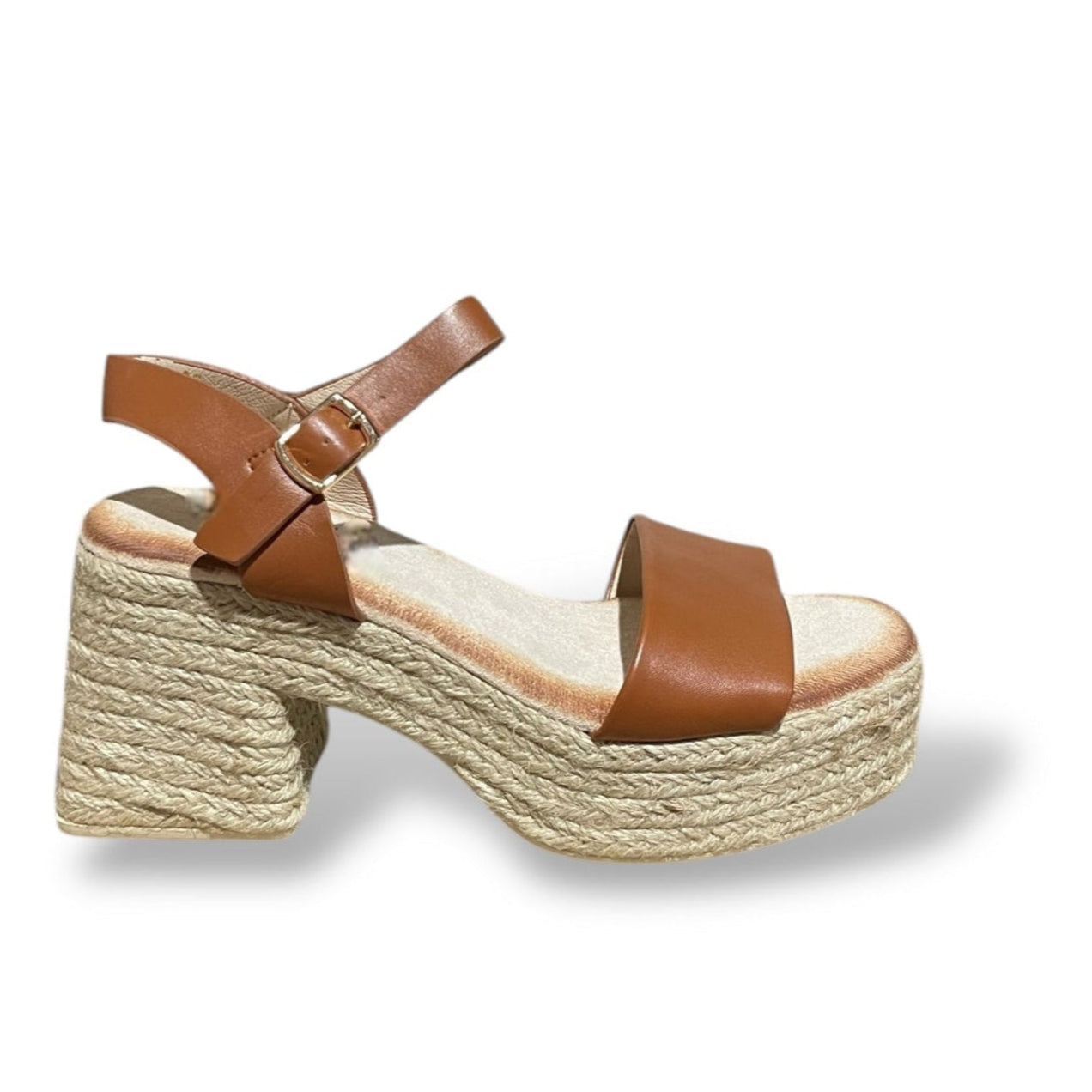 Sandalia de tacón ancho de esparto con plataforma y hebilla color camel