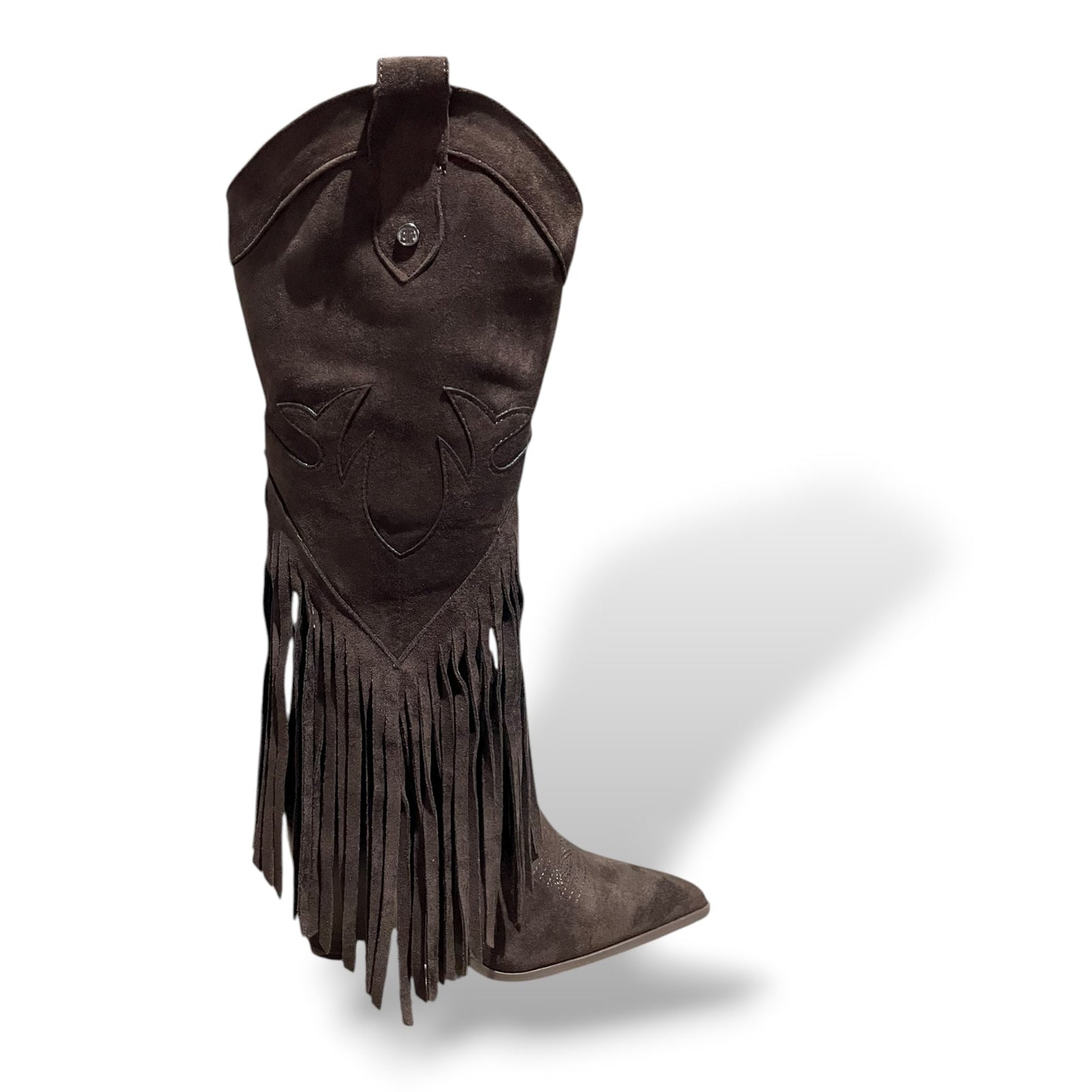 Bota cowboy chocolate, flecos, puntera de pico, cremallera lateral, tacón de 10cm y plantilla de gel