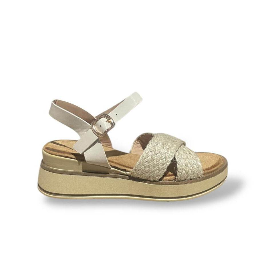Sandalia con cuña media de goma con tiras cruzadas y cierre de hebilla color beige