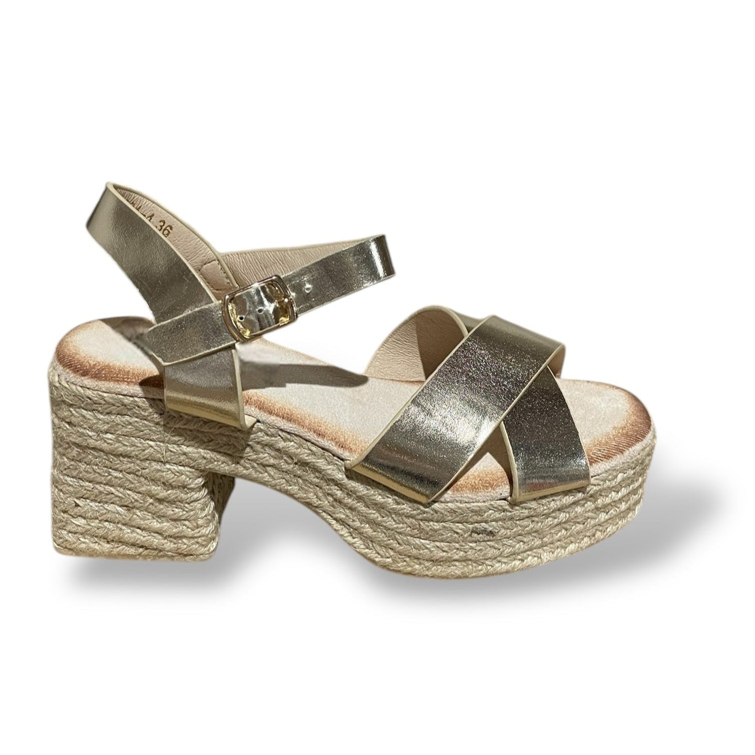 Sandalia de tacón ancho de esparto con plataforma y hebilla color oro