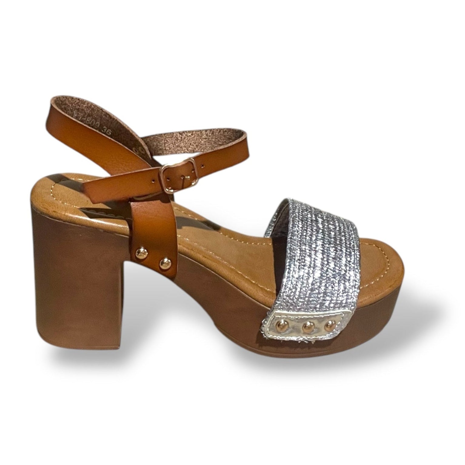 Sandalia de tacón de madera con tira delantera y hebilla color plateado
