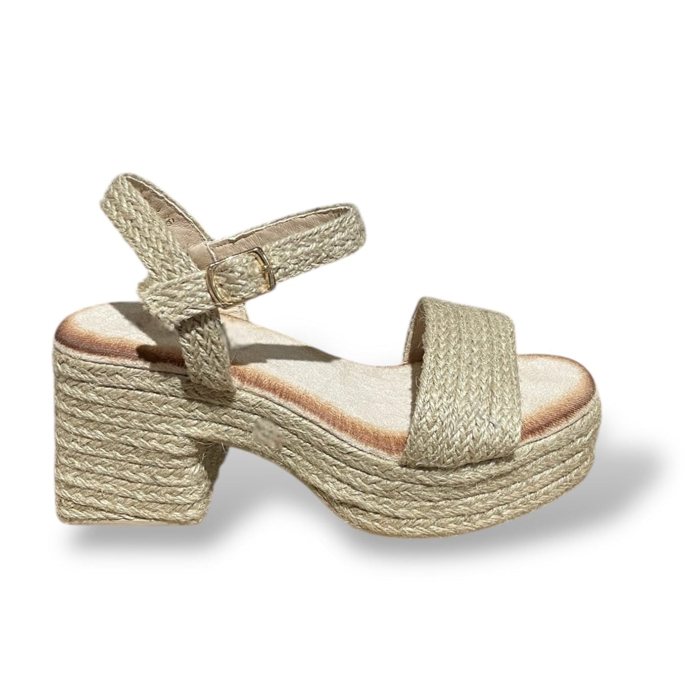 Sandalia de tacón ancho de esparto con plataforma y hebilla color beige