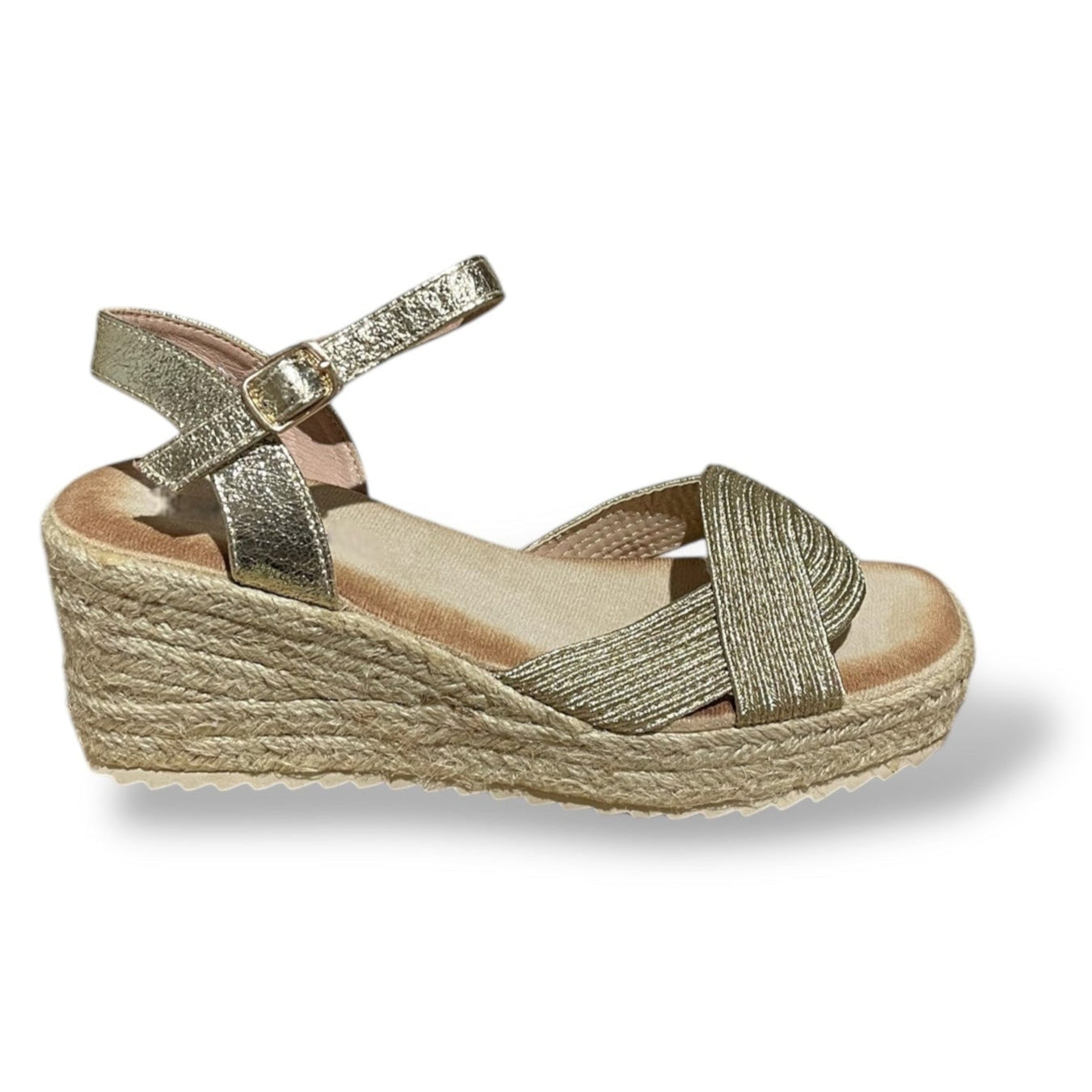 Sandalia de esparto con cuña baja y hebilla color oro