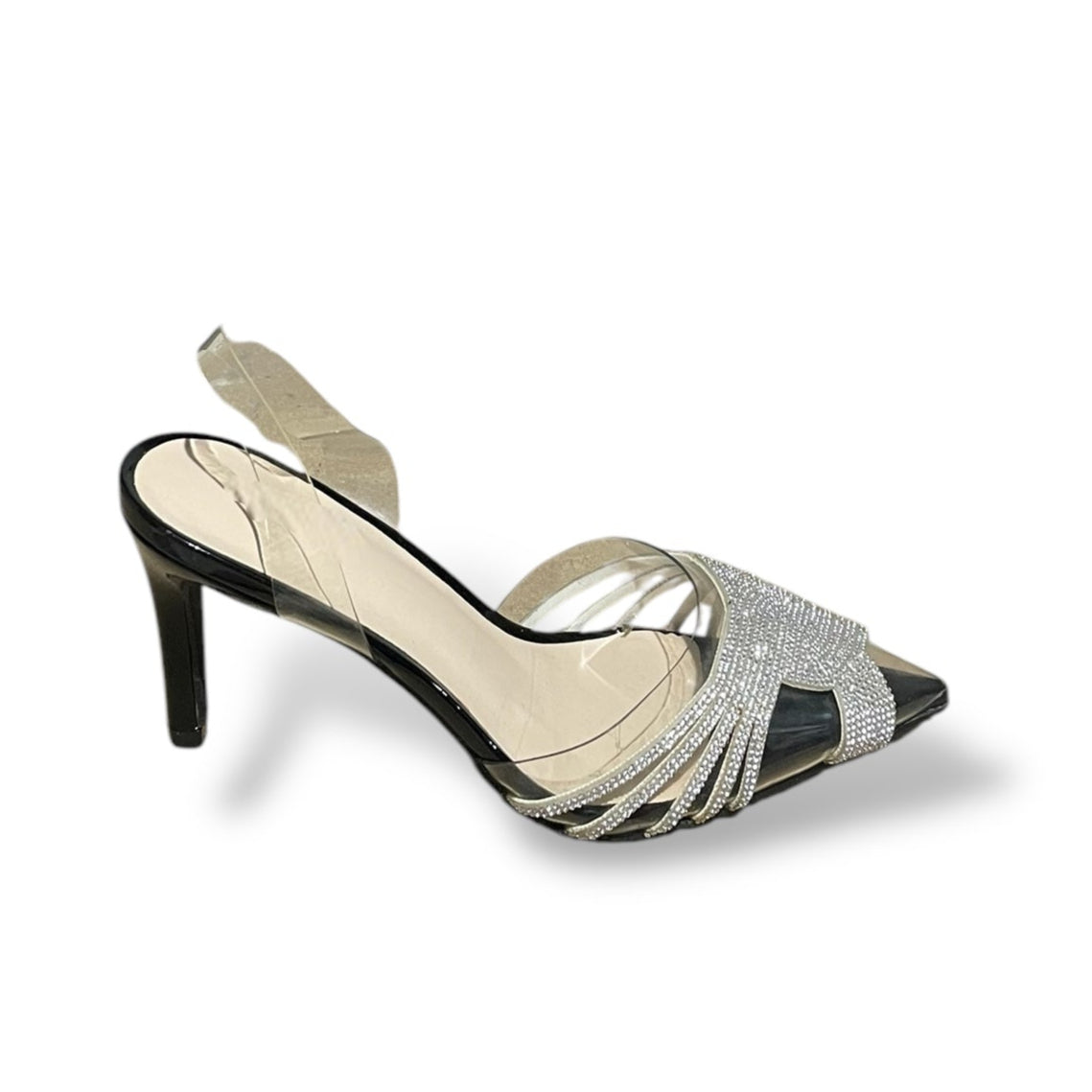 Sandalia de tacón fino color negro de punta con tiras transparentes y brillos